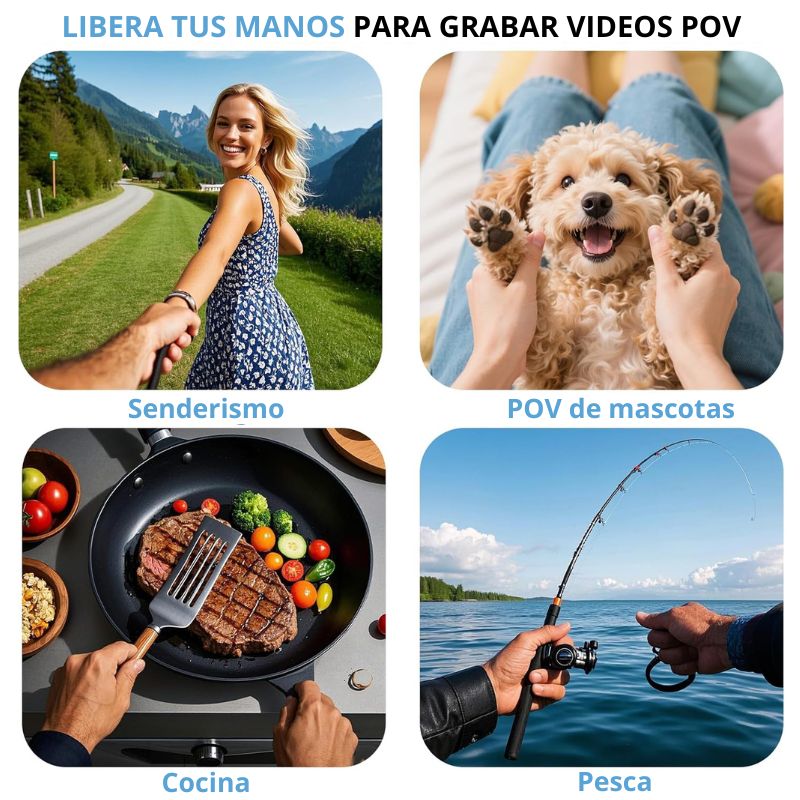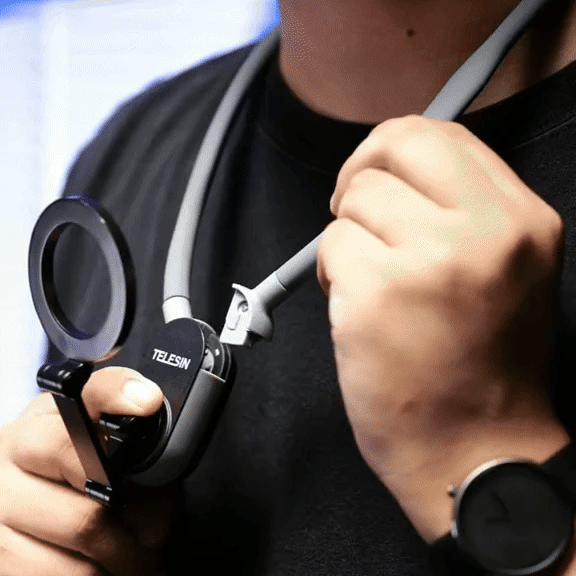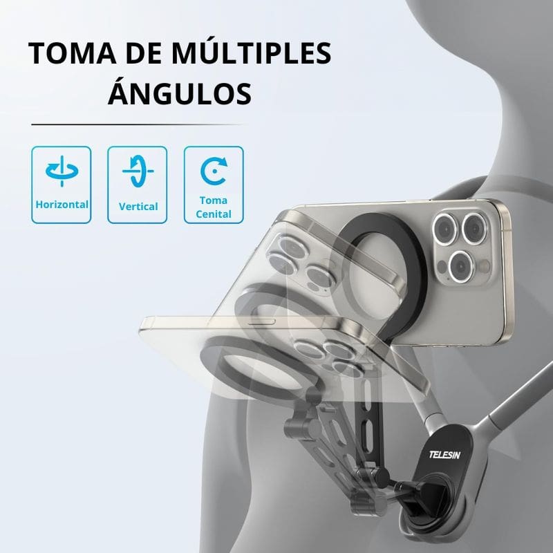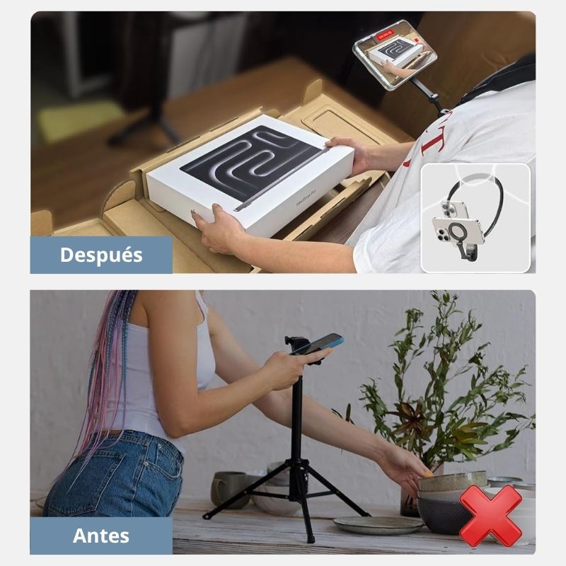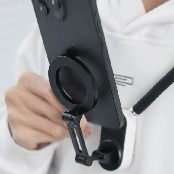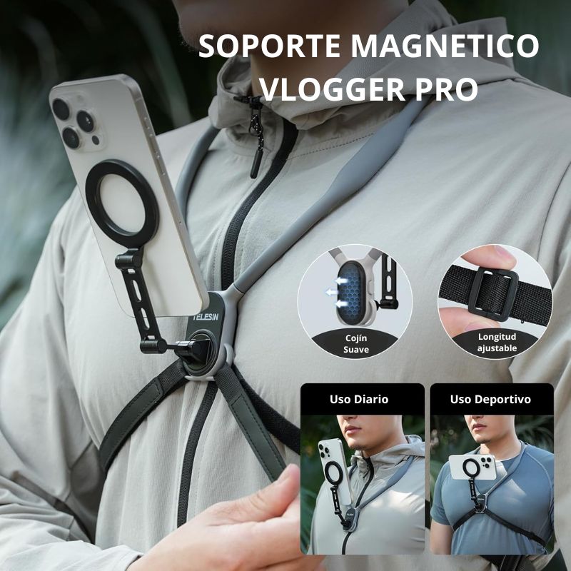 Nuestro Soporte Magnético Vlogger-Pro te libera las manos, te da un ángulo único desde el pecho/cuello y mantiene tu teléfono firme para que tú solo te preocupes por el contenido.